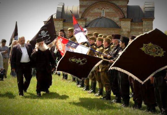 Председник Љуба Ненадовић и отац Јоле врше смотру почасног вода Равногорског Покрета, Марковдан пре две деценије.