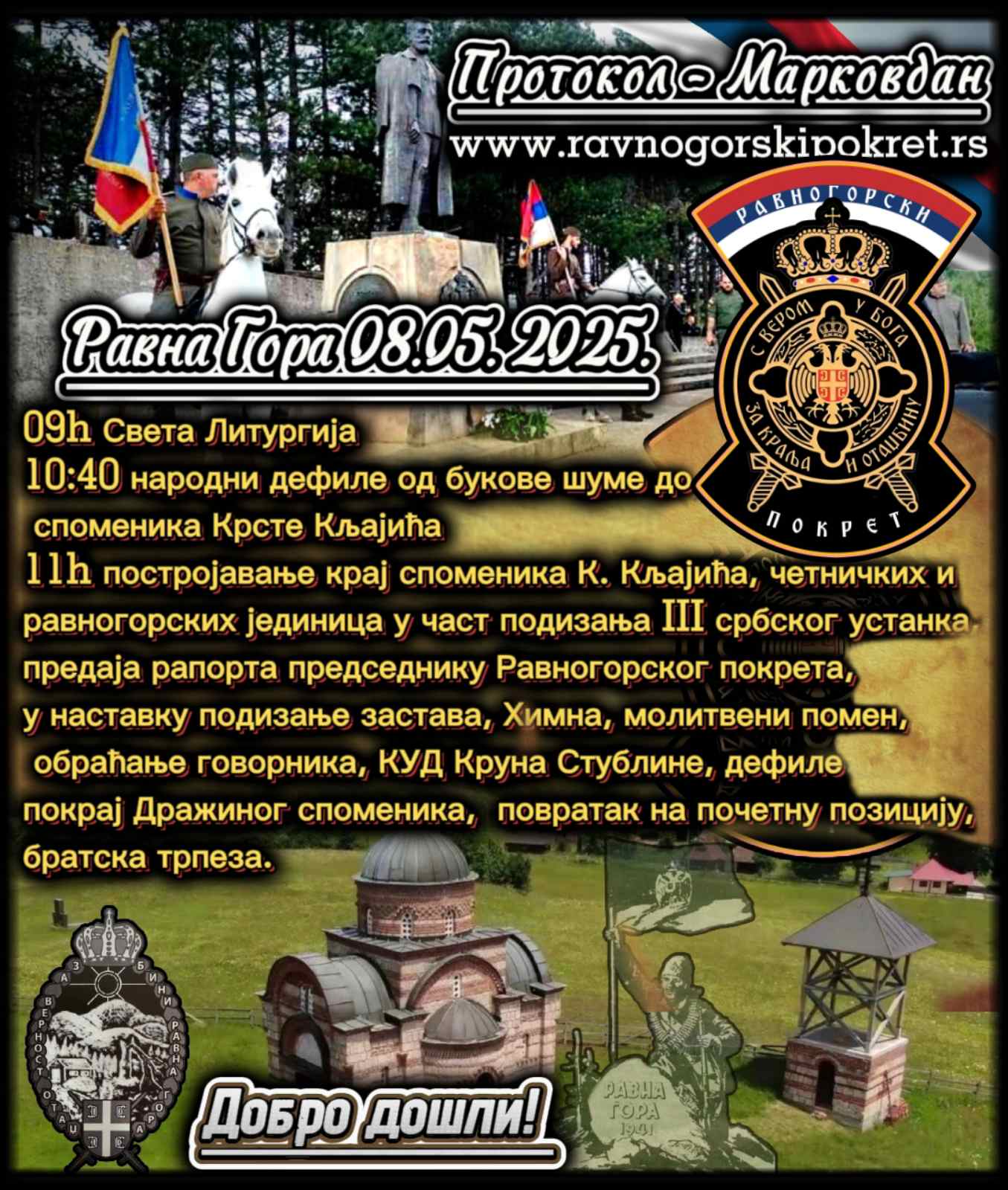 На Равној Гори је на Марковдан 08.05.2025. године обележена 84 годишњица од момента када је на тло ове сувоборске заравни крочила група непредатихвојника, под командом тада пуковника Драже Михаиловића. Молитвено, најпре светом Литургијом потом поменом, дефилеом, постројавањем, културно-уметничким програмом одата је пошта безгробном ђенералу Дражи и његовој многострадалној војсци.  Равногорски покрет са својим одборима као и браћом …